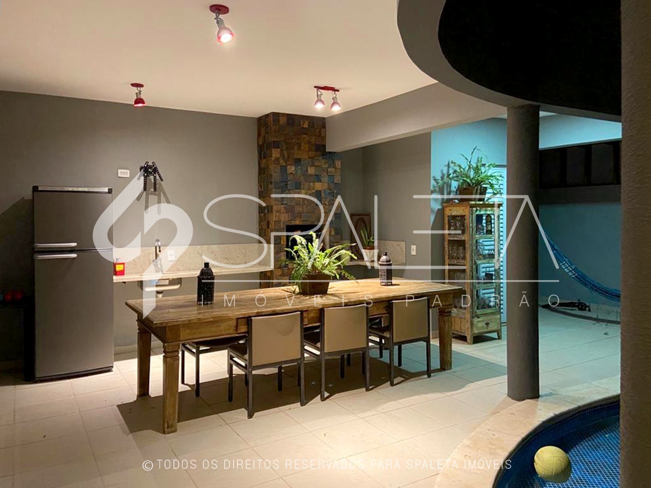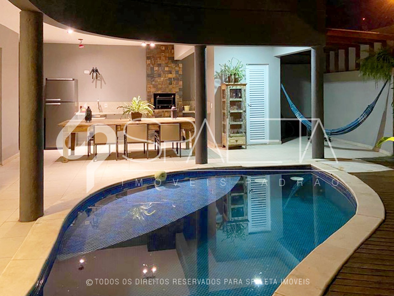 O primeiro piso dispõe de sala de estar com lareira, sala de TV e sala de jantar uniformemente integradas ao belíssimo espaço de lazer que oferece área gourmet com churrasqueira, piscina e redário. Lavabo. Cozinha e área de serviço.