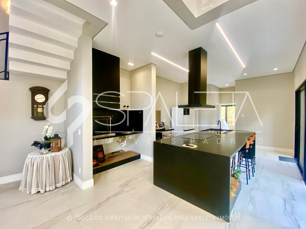 A sala integrada, com pé direito duplo de 6,91 metros, proporciona um ambiente amplo e iluminado, a ampla escada interna com vão permite a instalação de um elevador. O imóvel possui 3 suítes com varandas, sendo suíte principal com amplo closet e espaço para café e frigobar.